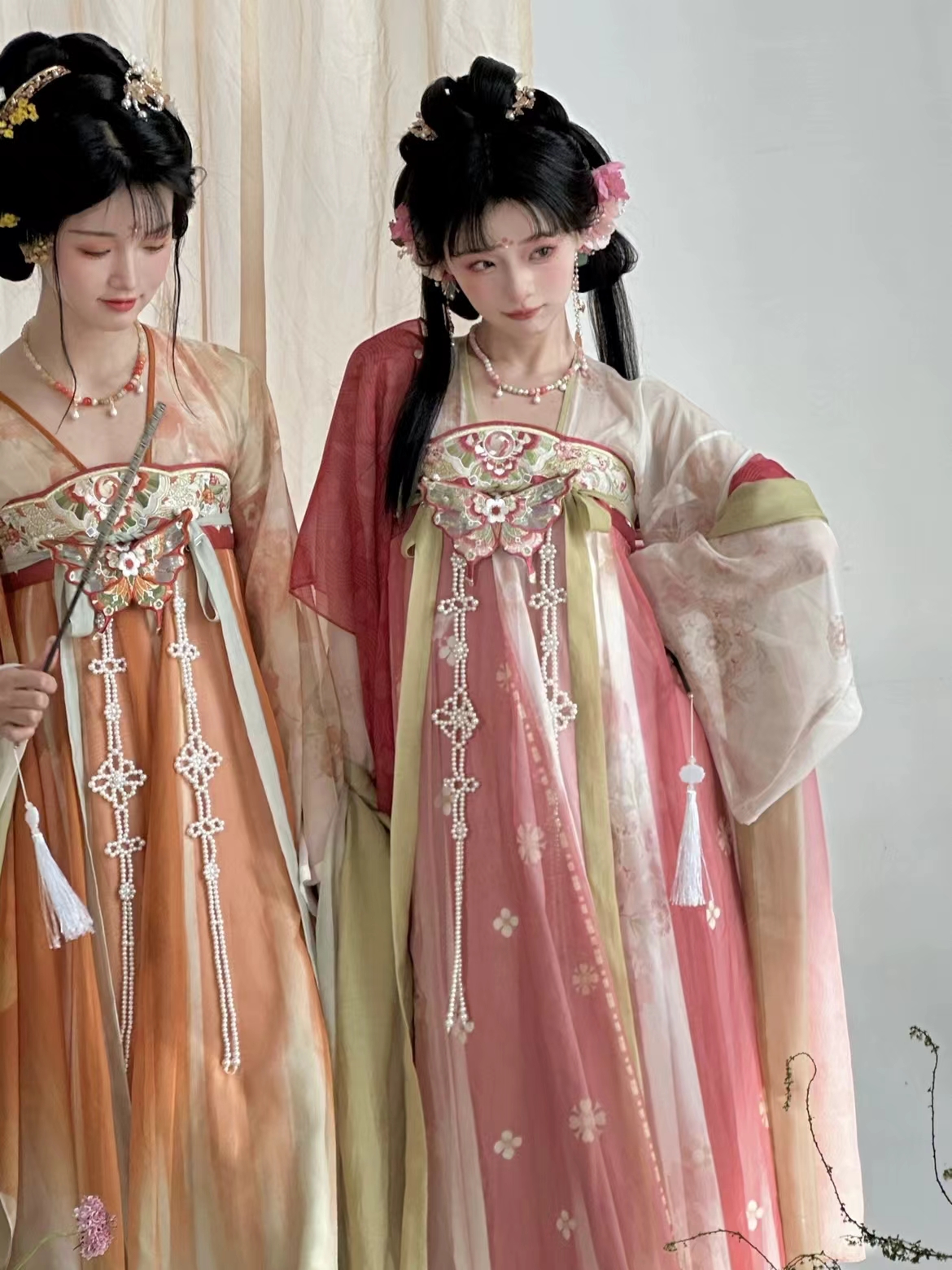 【榴月橙】与春国风【临安春时】唐制直领对襟衫齐胸破群汉服女款闺蜜装